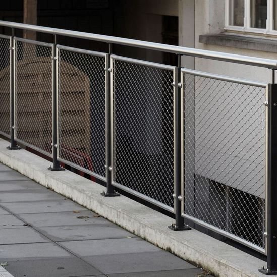 Craftsmen install custom railings on a building, blending safety and style with precision design and durable, high-quality materials.